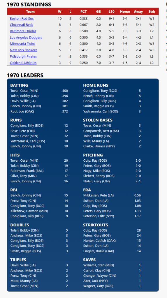 Boston maintains their 3-game lead on Cincinnati. Baltimore, Los Angeles and Minnesota are all at .500, but the Twins have won three straight games. Tovar is leading the league at .400 and is also on top of the hits and stolen bases list. Pittsburgh is heading in the other direction, having dropped their last three games. Willie Stargell is mired in a .140 slump with 14 strikeouts. Their best reliever, Dave Giusti is 0-2.