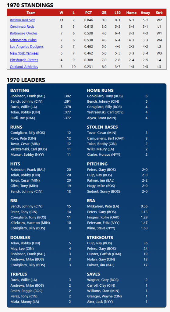 HR- Bert Campaneris (1), Reggie Jackson (2); Carl Yastrzemski (4), Mike Andrews (2), Tony Conigliaro (6).