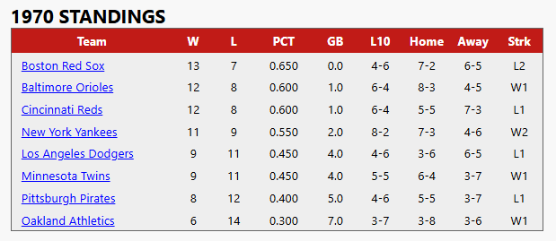 Despite their loss, Boston is clinging to first place by a game. Baltimore and Cincinnati are now tied for second place. Rod Carew and Manny Sanguillen are closing in on Bobby Tolan for the batting crown.