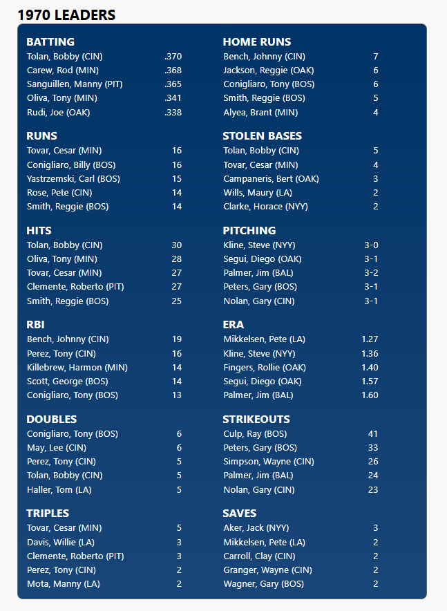 HR- Reggie Jackson (6), Gene Tenace (4), Don Mincher (4)