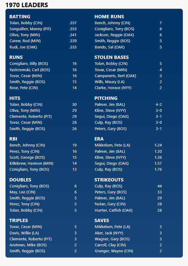 Bobby Tolan of the Reds remains in the lead for the batting title, but Manny Sanguillen of Pittsburgh is hot on his tail. Tolan also leads the league in hits and stolen bases. Johnny Bench still holds the lead in home runs and runs batted in. On the pitching front, the Orioles’ Jim Palmer is the first four game winner but has lost two games. He also has the lowest ERA of a starter, at 1.30.