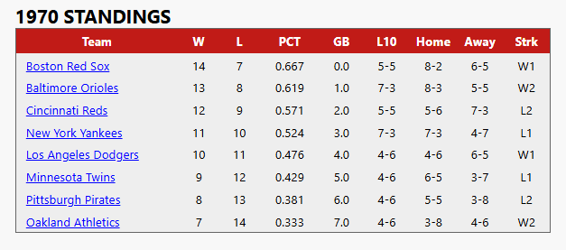 Last place Oakland has had some big wins of late. They put up twelve runs against the Twins, beat the first place Red Sox and now, upset another powerhouse team in Cincinnati, whom they beat, 7 to 2. Sal Bando clubbed two home runs and Bert Campaneris took Gary Nolan deep on the game’s first pitch. It was Catfish Hunter’s first win and a complete game, to boot.
