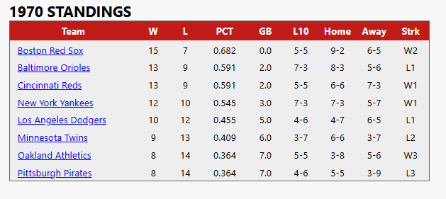 Boston has increased their lead to 2 games over Baltimore and Cincinnati, who are now tied for second place. The Yankees are the final first division club and the only other one at .500 or above. Los Angeles and Minnesota are fading. Oakland is improving, having won three straight, while Pittsburgh has dropped three in a row. The result of which is that the A’s and Pirates are now tied for last place.